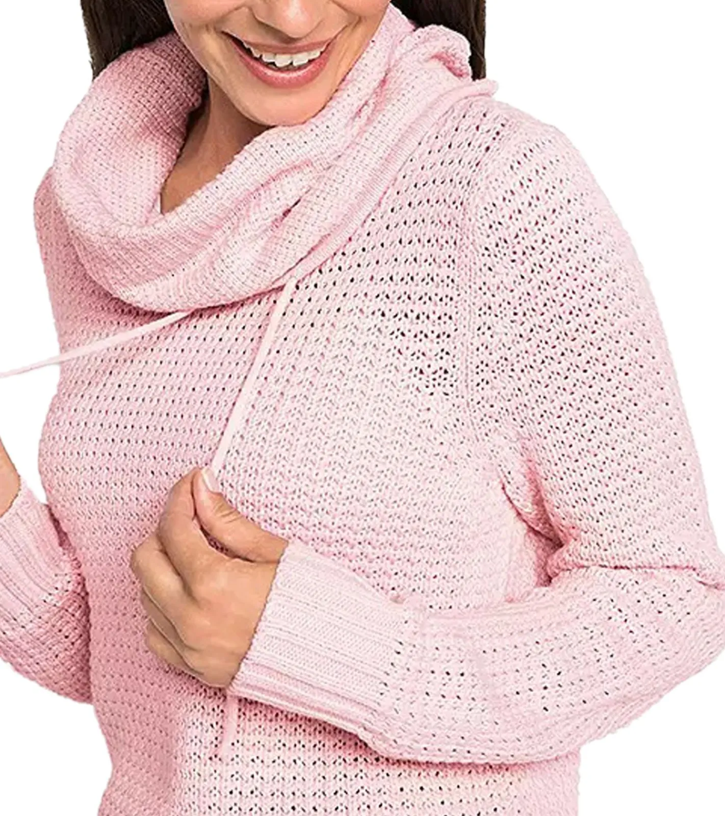 Damen Strick-Pullover mit Rollkragen und Kordelzug im Zopfmuster Baumwoll-Pullover Freizeit-Sweater 962955 Rosa