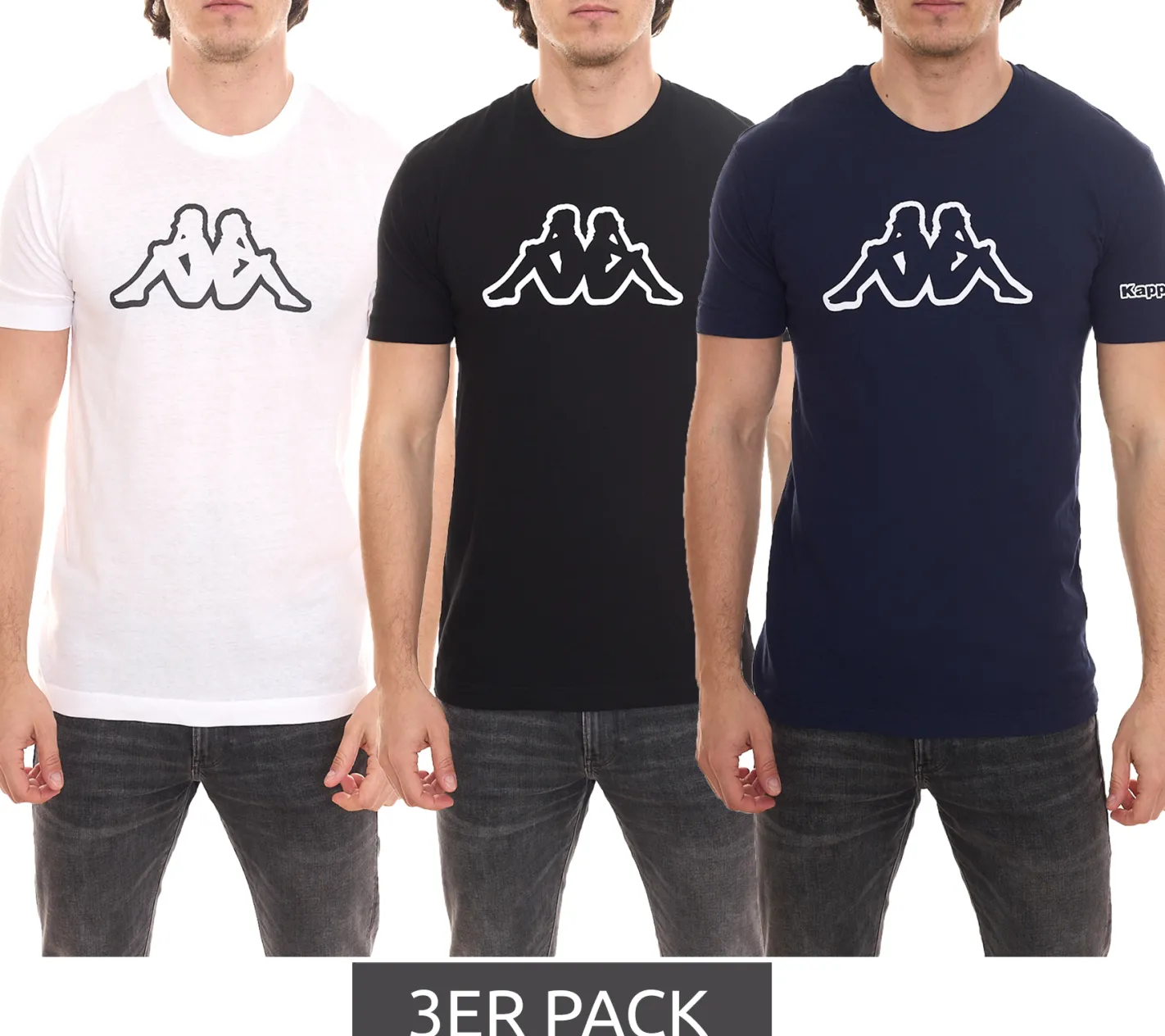 3er Pack Kappa Herren Baumwoll-Shirt Rundhals-Shirt mit großem Logo-Patch Kurzarm-Shirt Blau, Schwarz oder Weiß