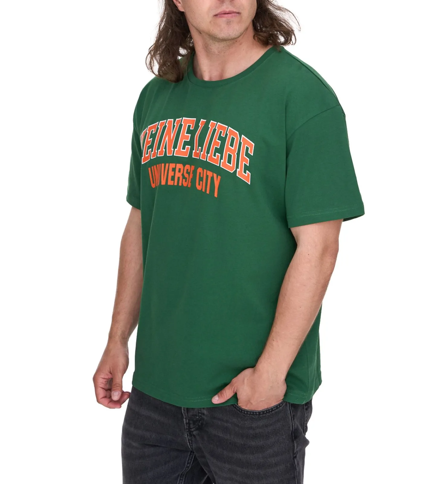 KEINE LIEBE Universe City Herren Baumwoll-Shirt mit farblichen Akzenten T-Shirt Rundhals-Shirt Kurzarm-Shirt KLTS1010 Grün/Orange