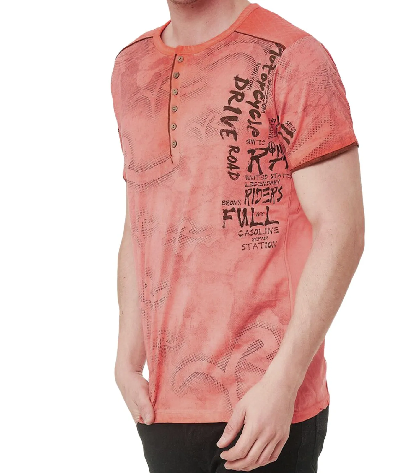 Herren T-Shirt mit Urban-Print Baumwoll-Oberteil Sommer-Rundhals-Shirt mit Knopfleiste S-15246 Orange