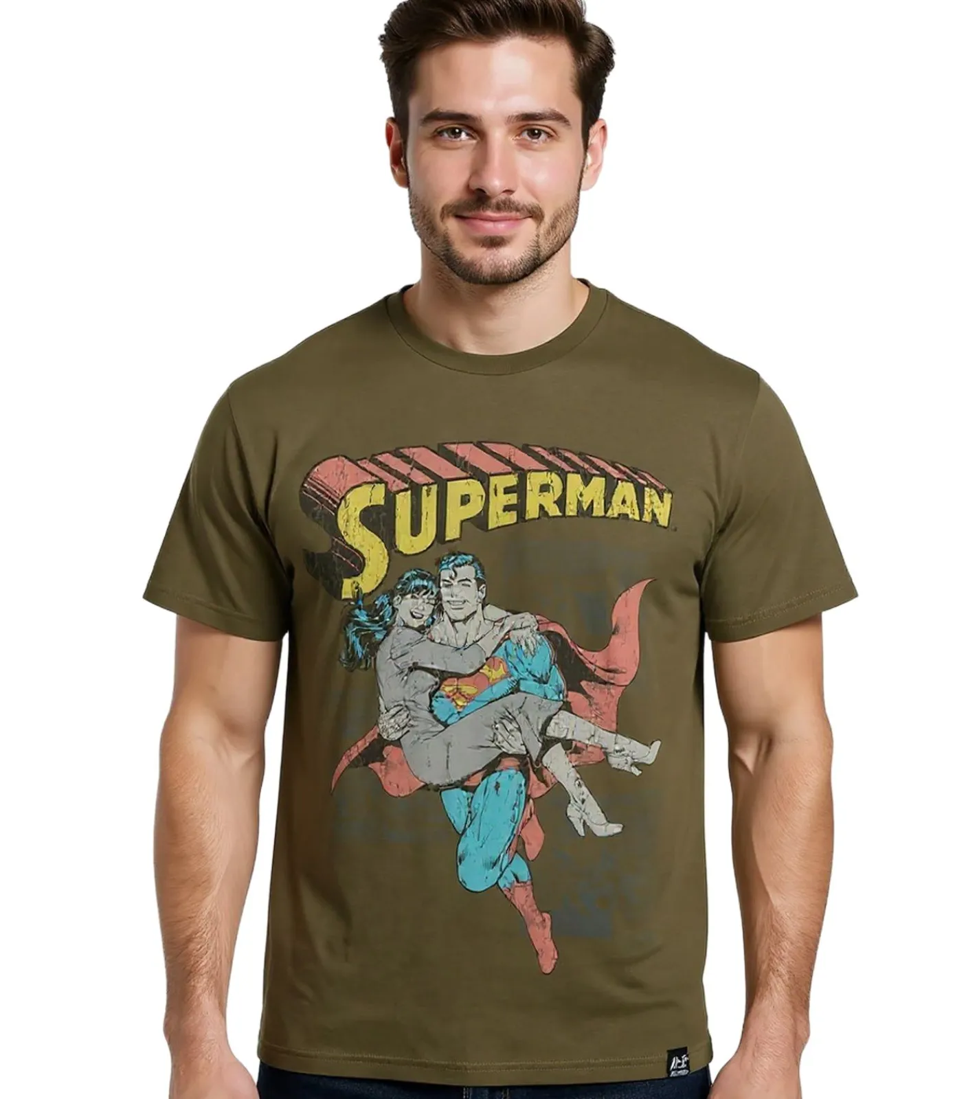 RE:COVERED X SUPERMAN DC Herren T-Shirt mit Comic-Print Baumwoll-Shirt Rundhals-Shirt RCWARN555 Khaki