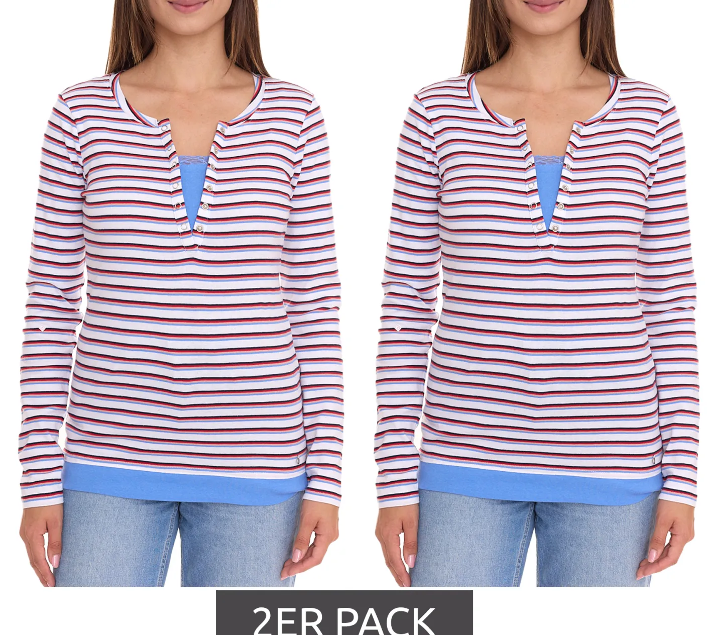 2er Pack AjC Damen Langarm-Shirt mit Spitze figurbetontes Baumwoll-Shirt 12726709 Weiß/Blau/Rot