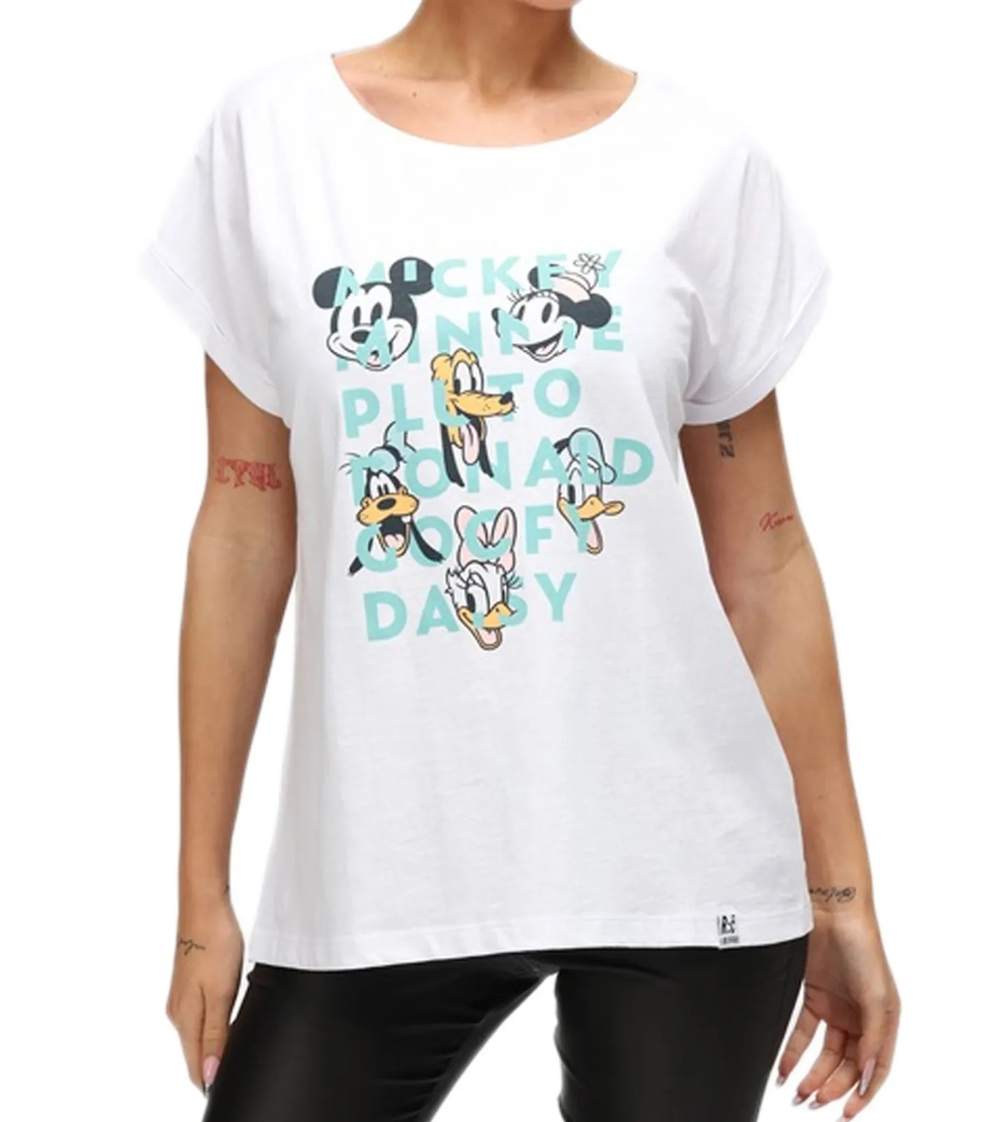 RE:COVERED X Disney Damen T-Shirt mit Mickey Mouse and Friends Aufdruck Baumwoll-Shirt Rundhals-Shirt RCDIF2065 Weiß