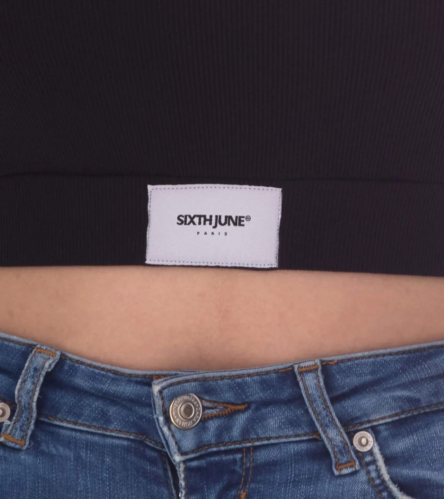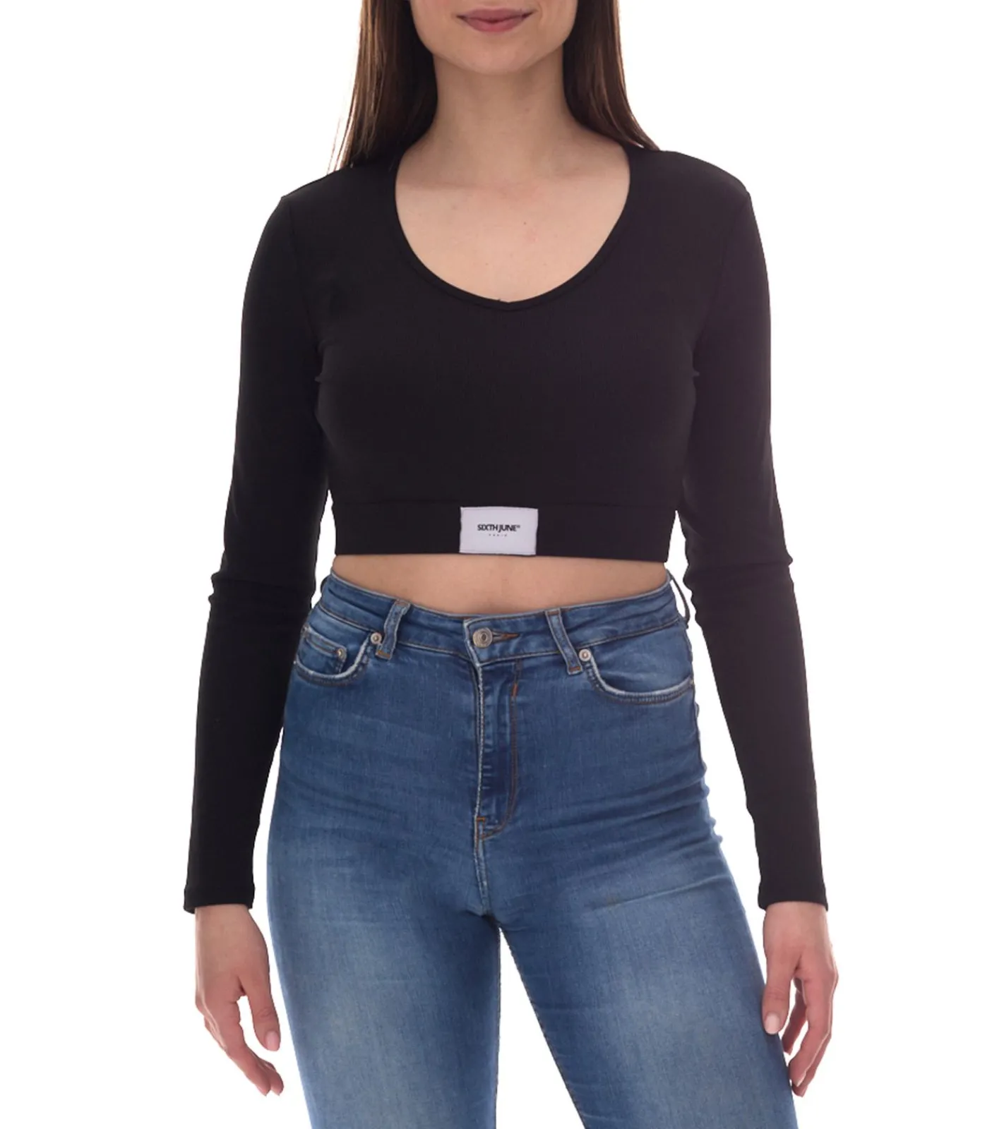Sixth June V-Neck Damen Crop-Top mit elastischem Band und Label-Patch Langarm-Top geripptes Sommer-Shirt W34113KTO Schwarz