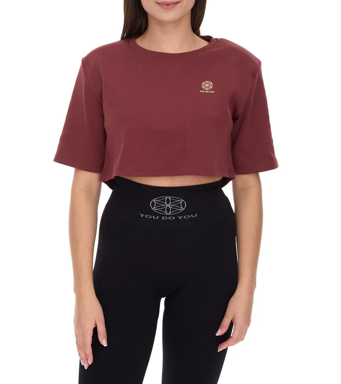 YOU DO YOU Damen T-Shirt im Cropped-Style Fitness-Top mit Rücken-Cut Out Baumwoll-Shirt Yoga-Mode 905051 Mahagoni-Braun